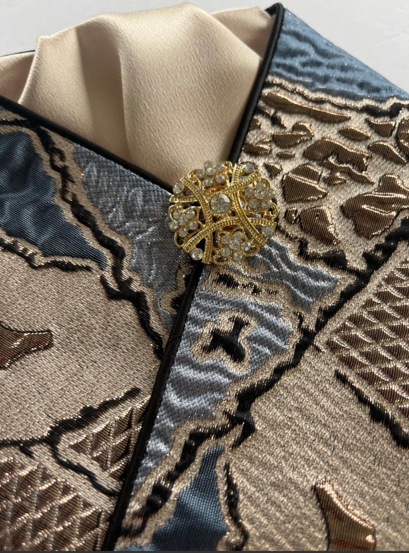 Abstract brocade patterned fabric with champagne accents. Due to the nature of this pattern, you may receive a different section on the fabric in your stock tie but all colors will be represented. It is finished with gold brooch. This stock tie goes very well with multiple colored coats making it one of our most versatile.