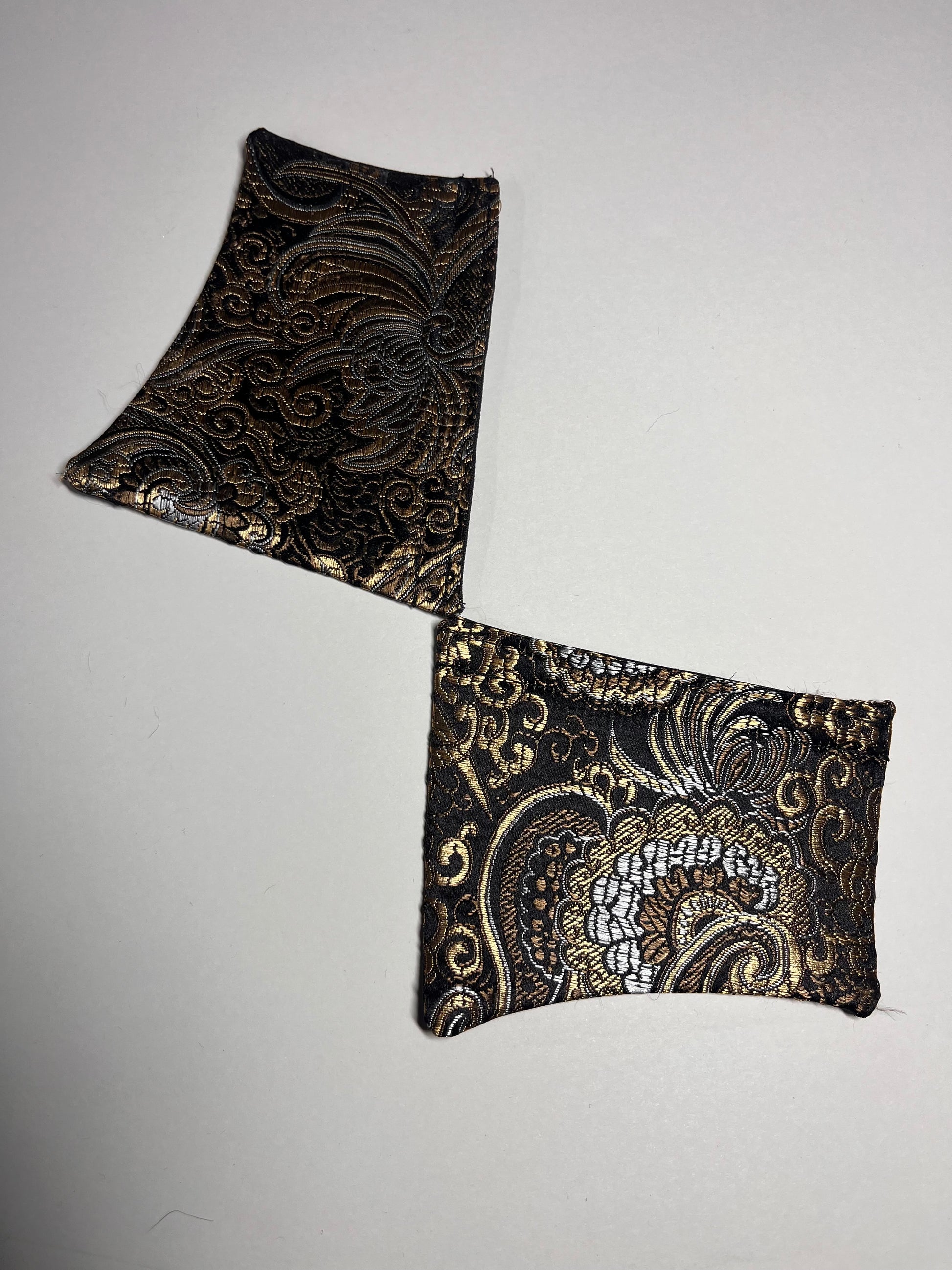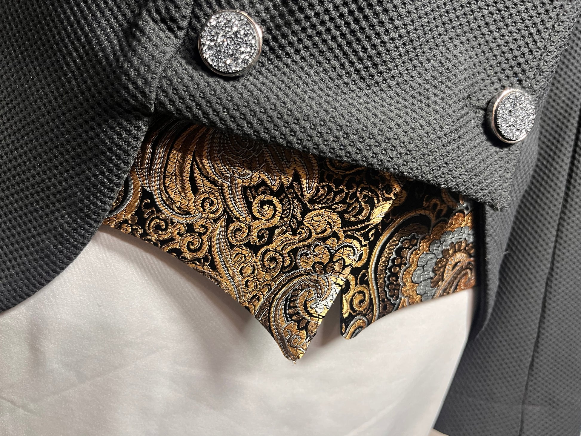 Black silk with bronze silver and gold metallic accents. Points attach using the hook and loop.