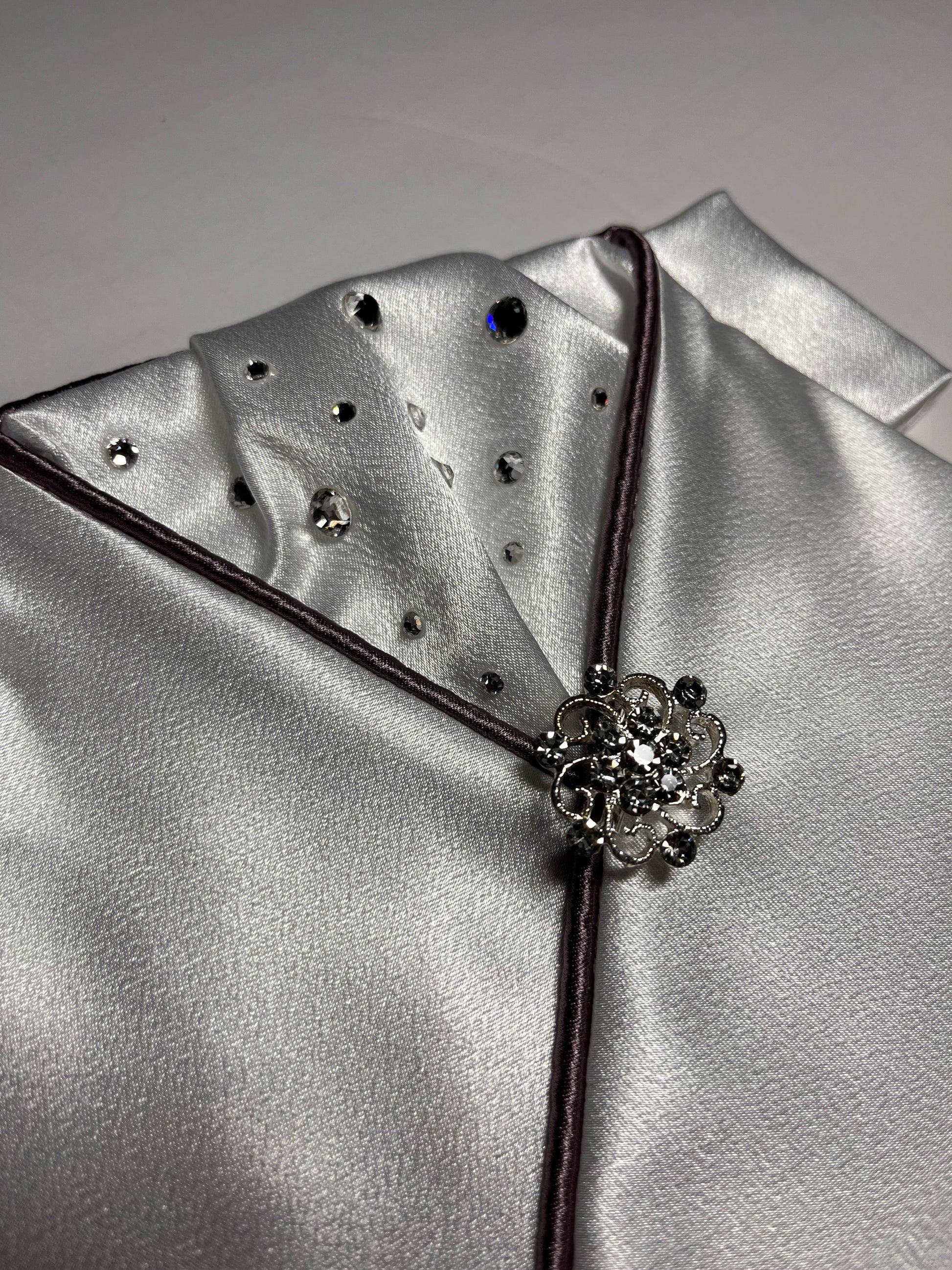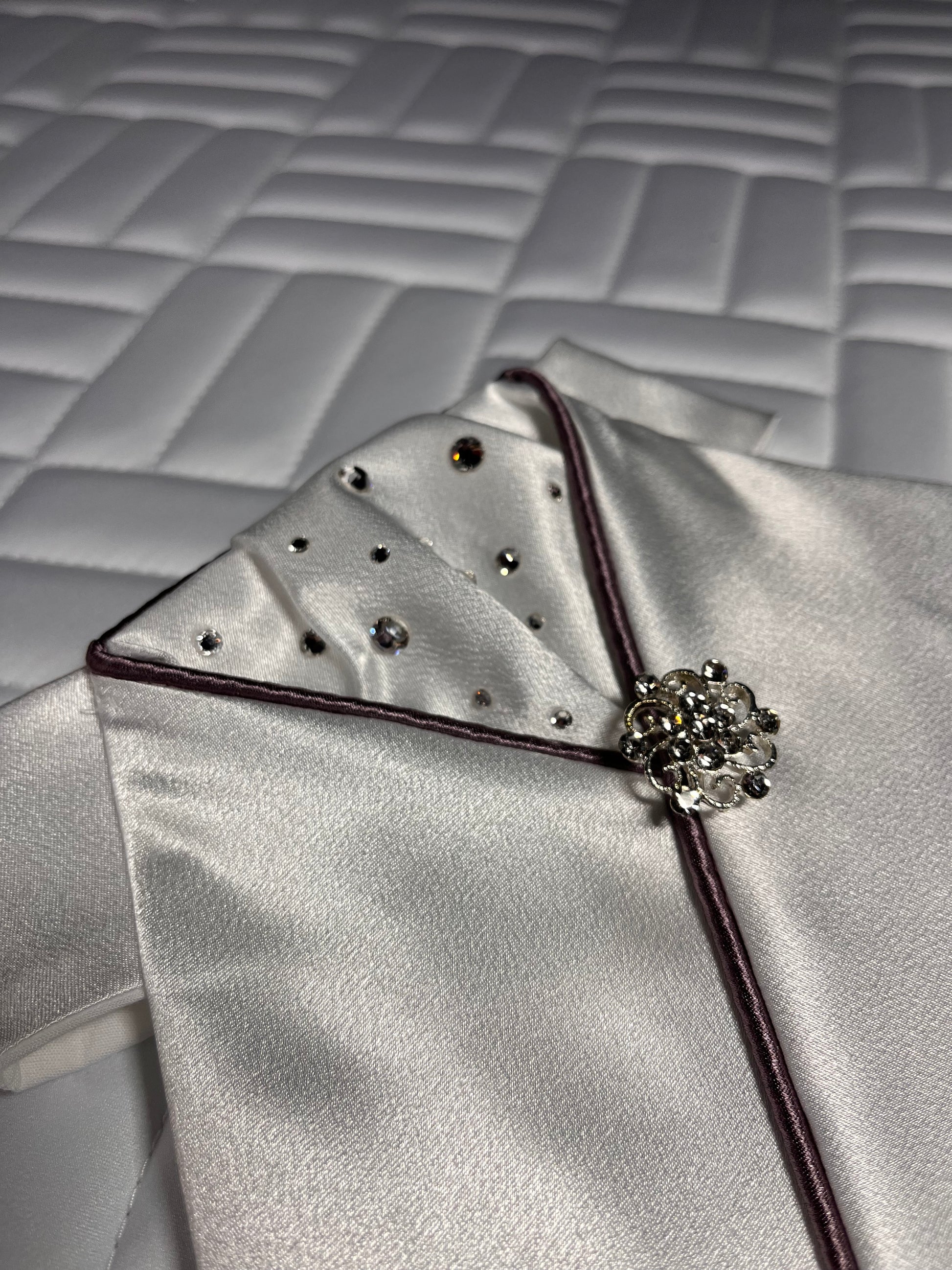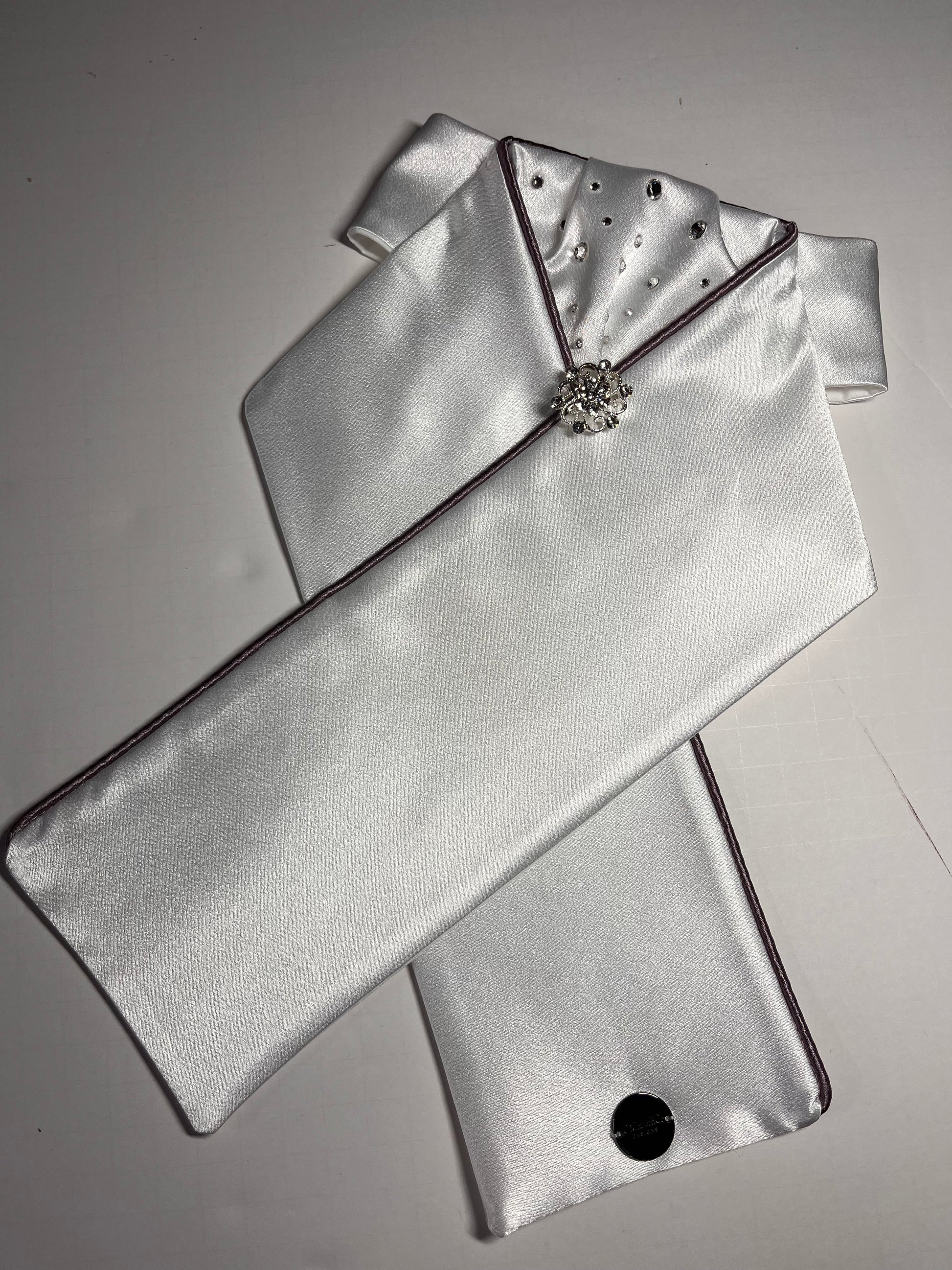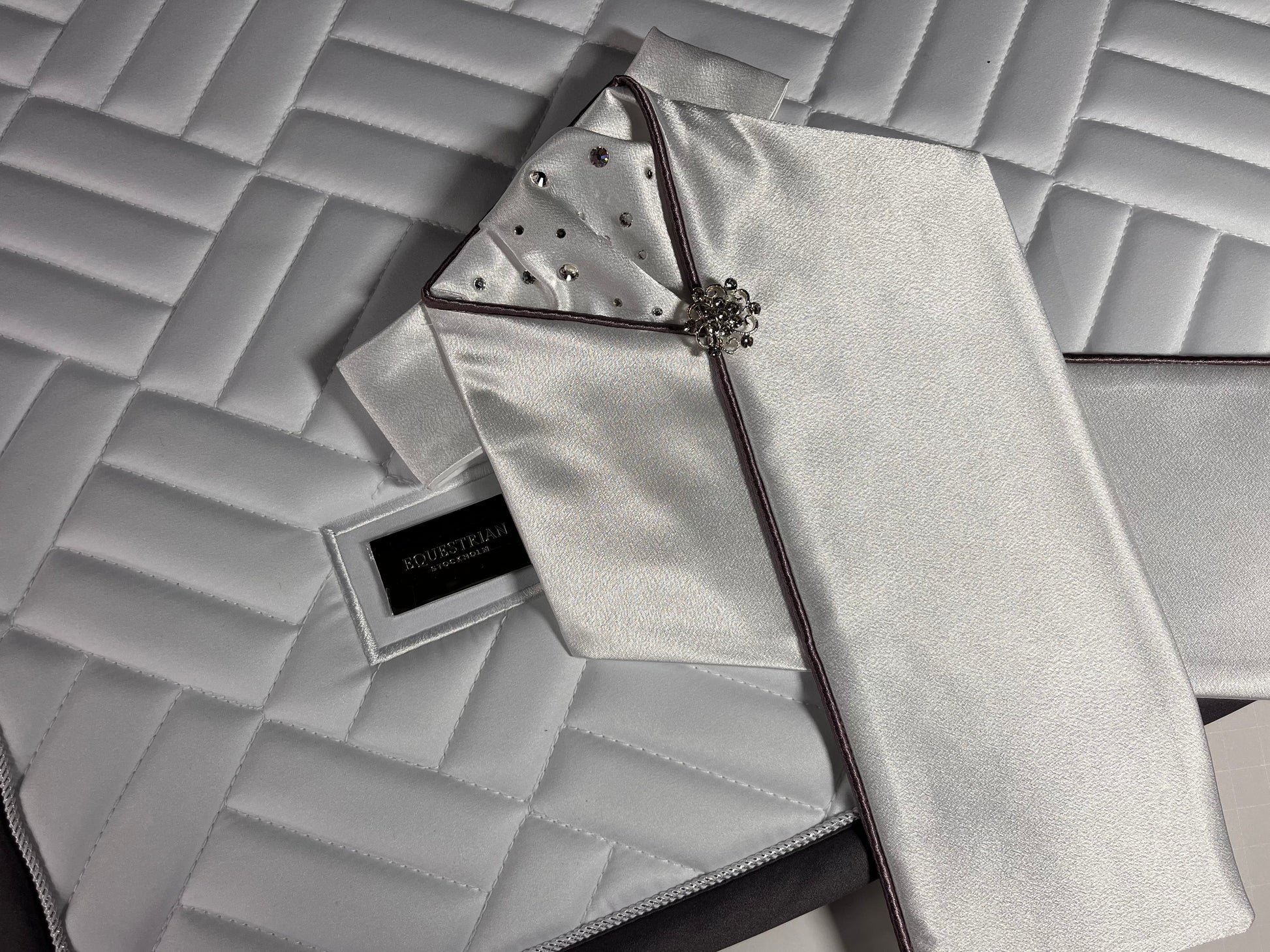 Equestrian Stockholm White with Dark Violet border Bundle set. Included in this bundle is the full size saddle pad and a crisp white stock tie with matching violet piping. This stock tie is decorated with PRECIOSA crystals and finished with a crystal brooch.