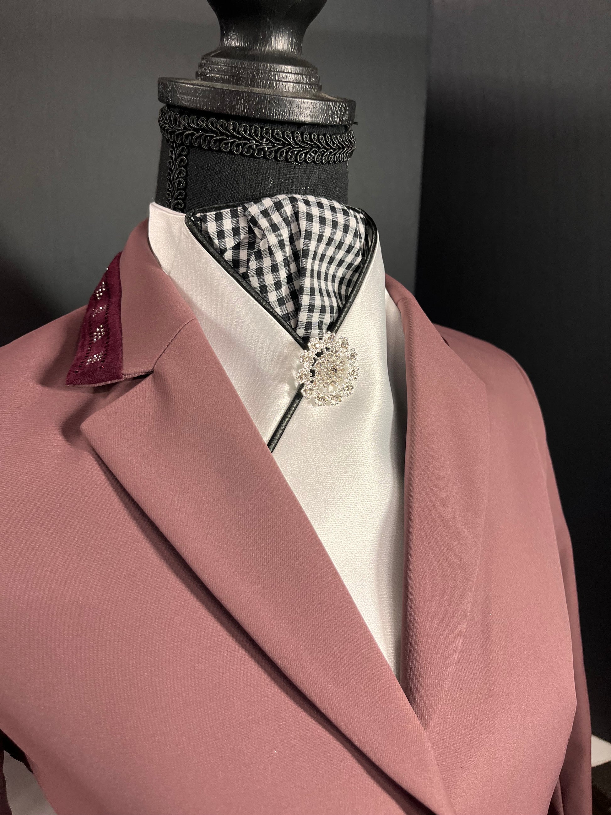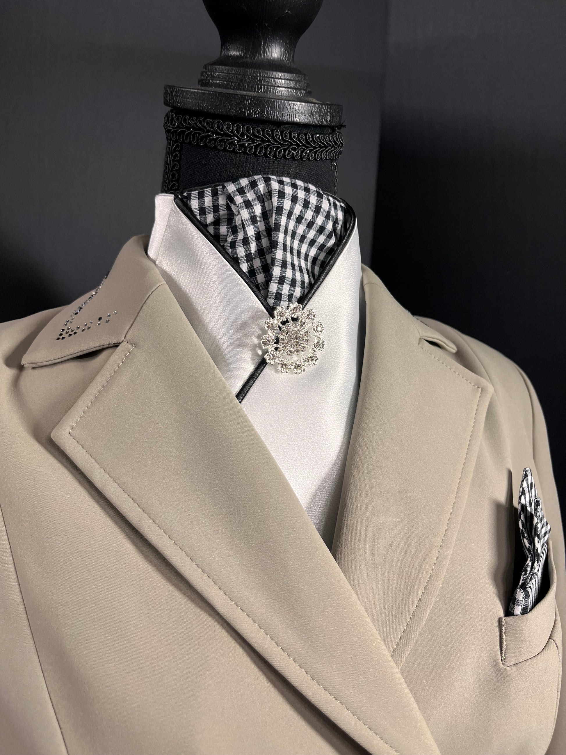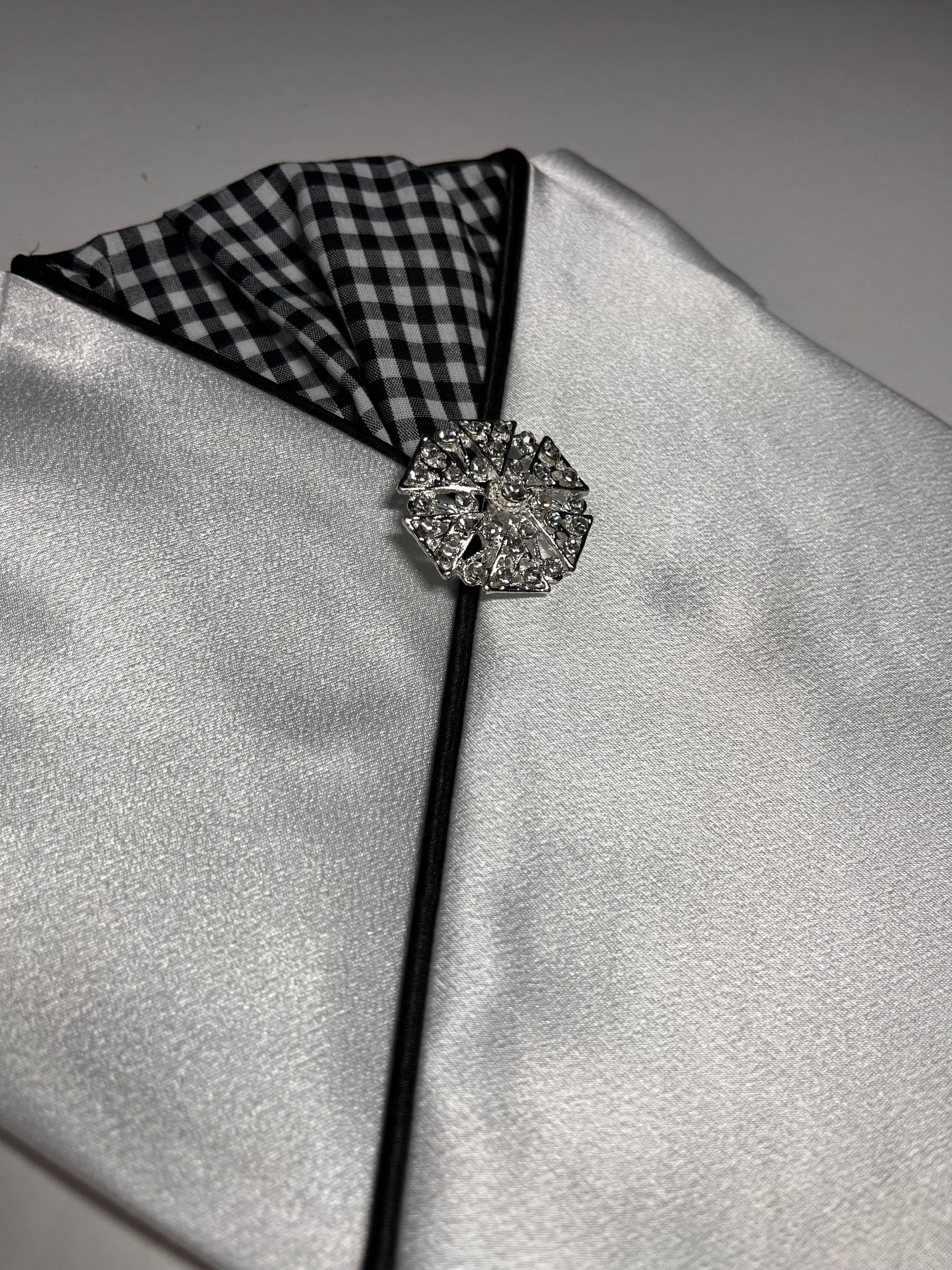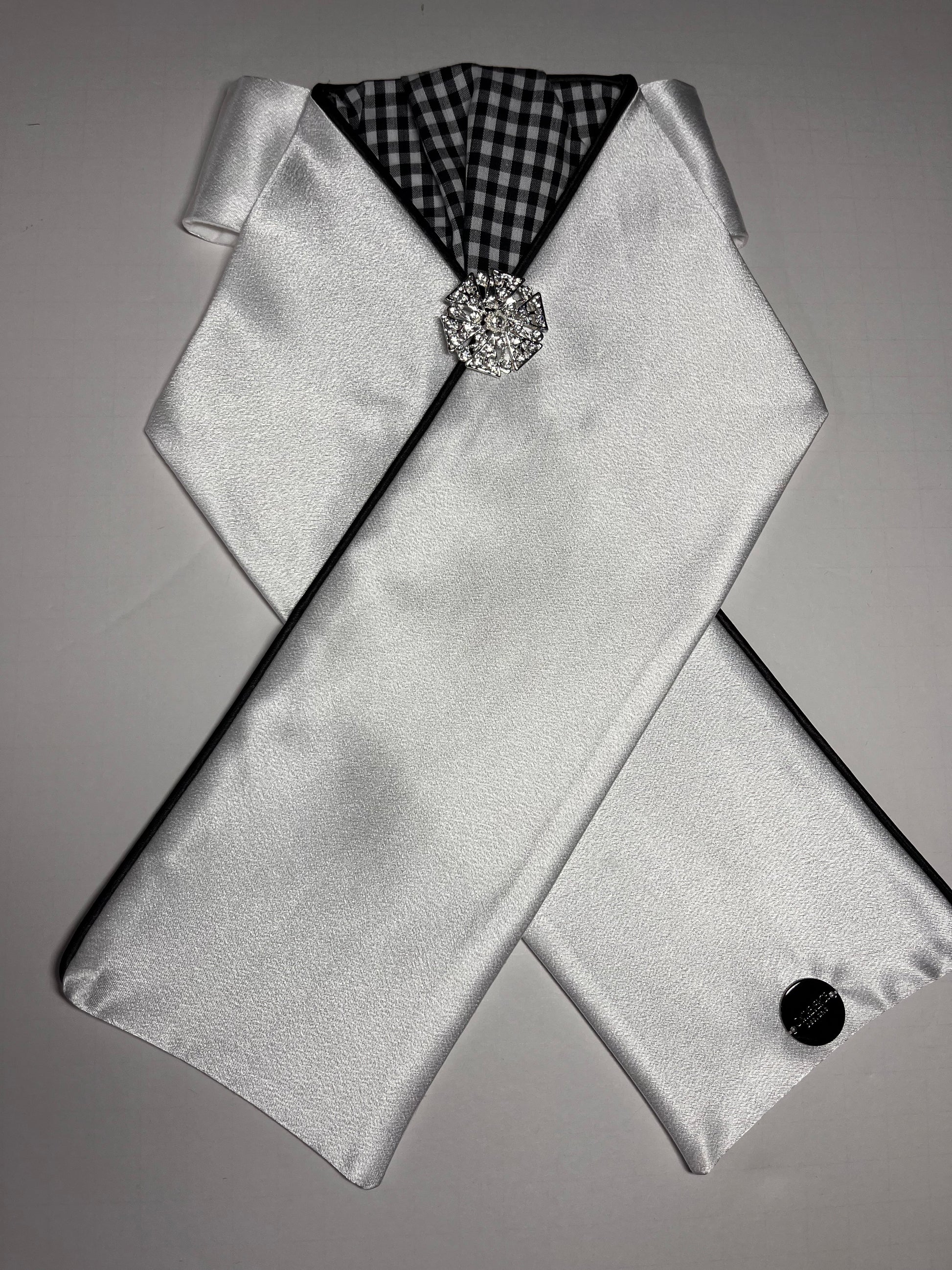 Crisp white satin with a gingham pattern accent. Black piping and a silver brooch finish this look.