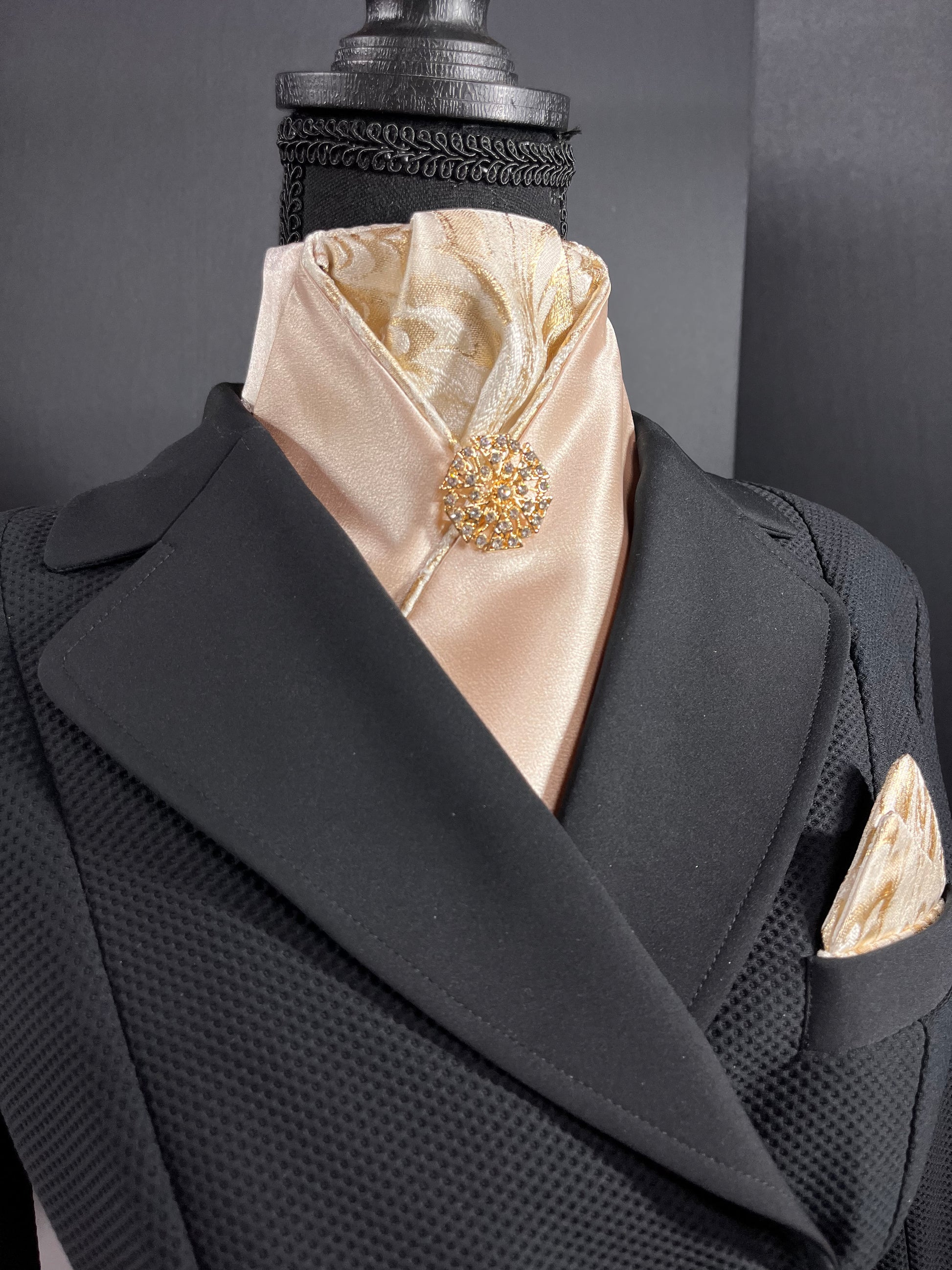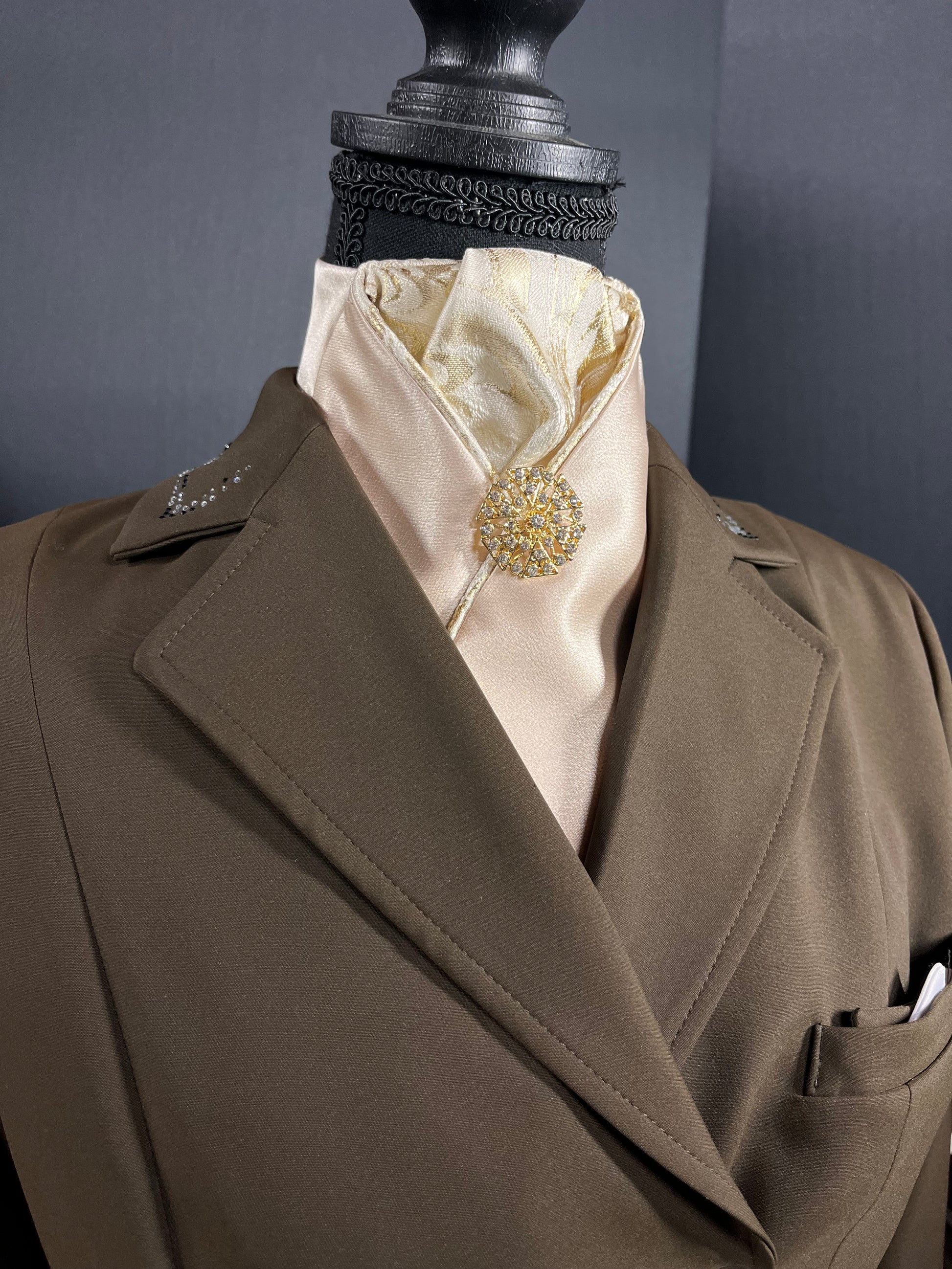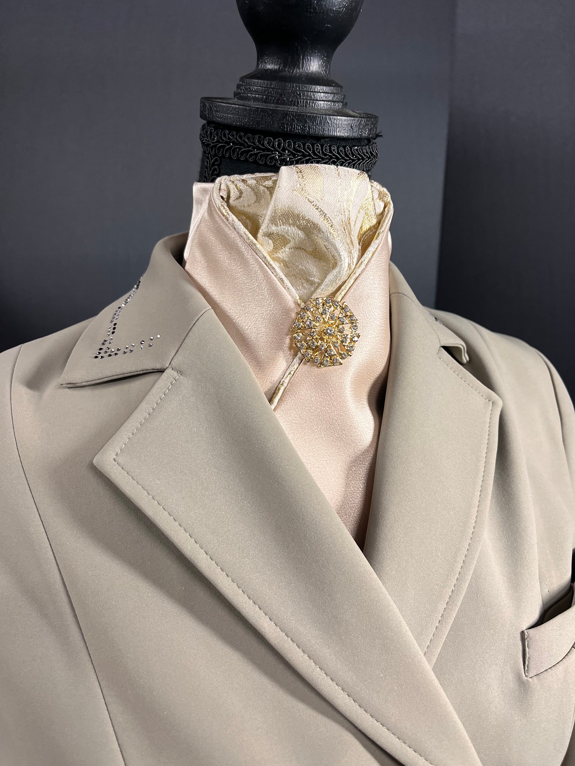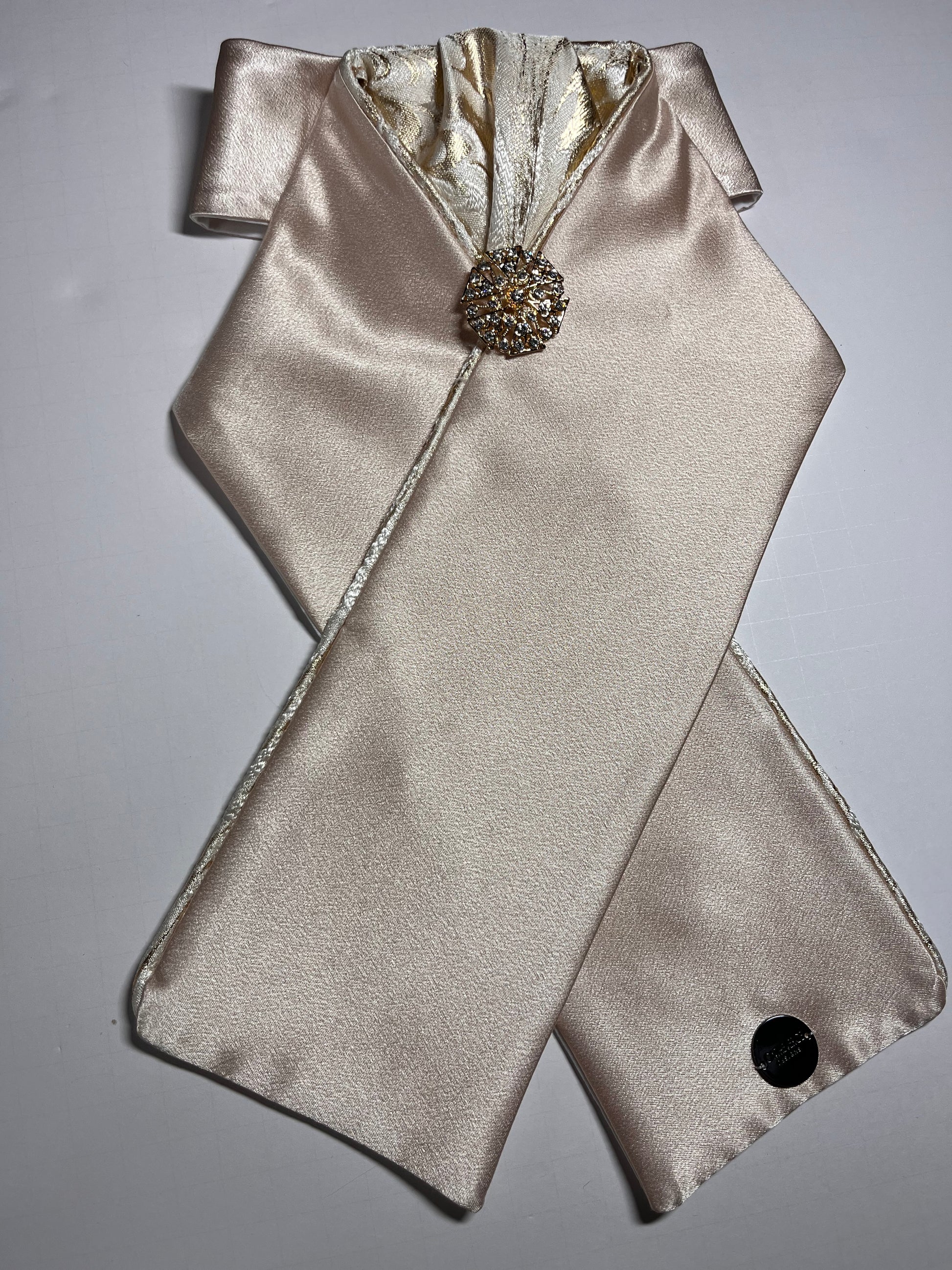 Champagne satin with gold white and champagne brocade fabric accents at the neck. Finished with a gold brooch.