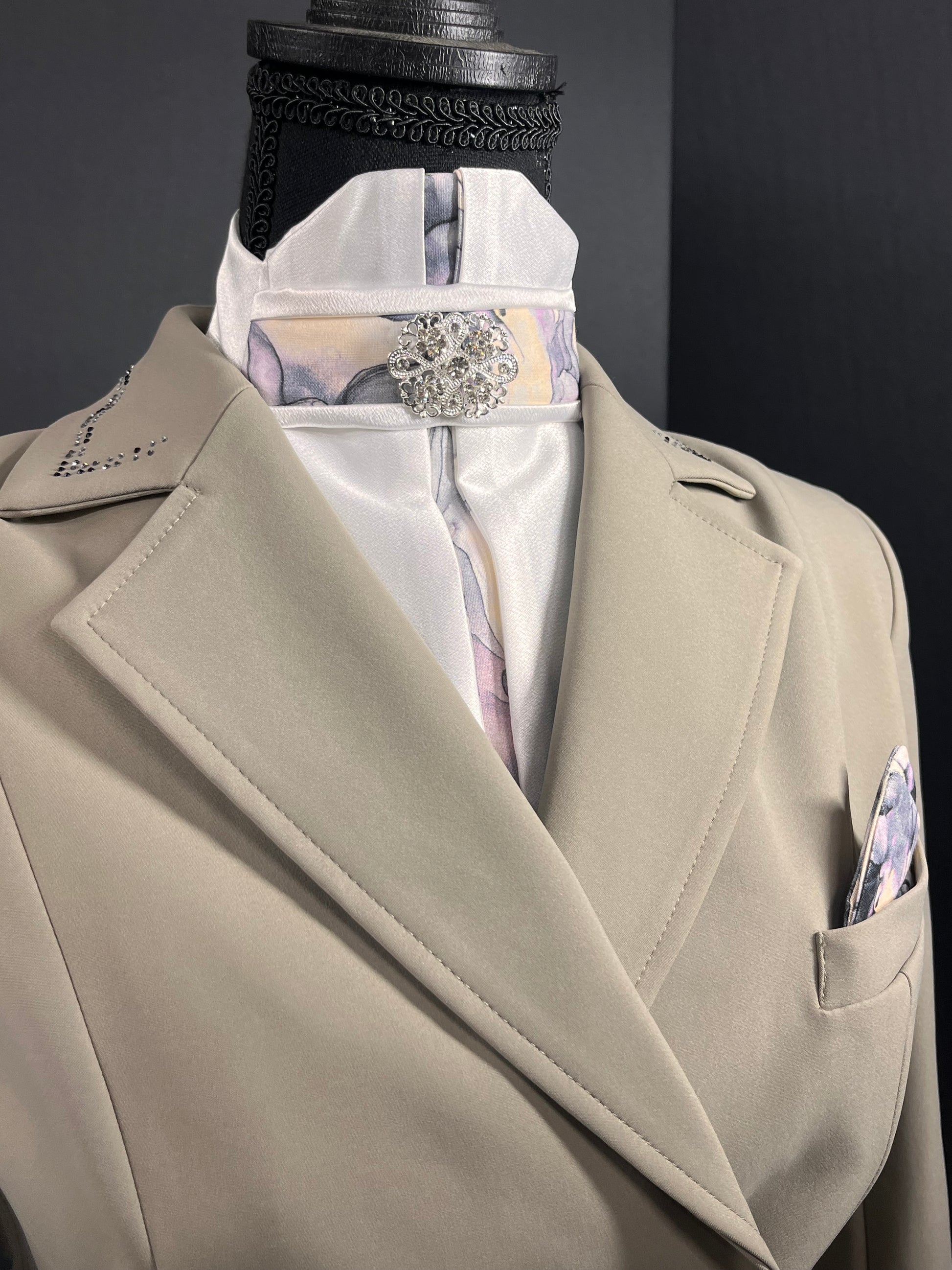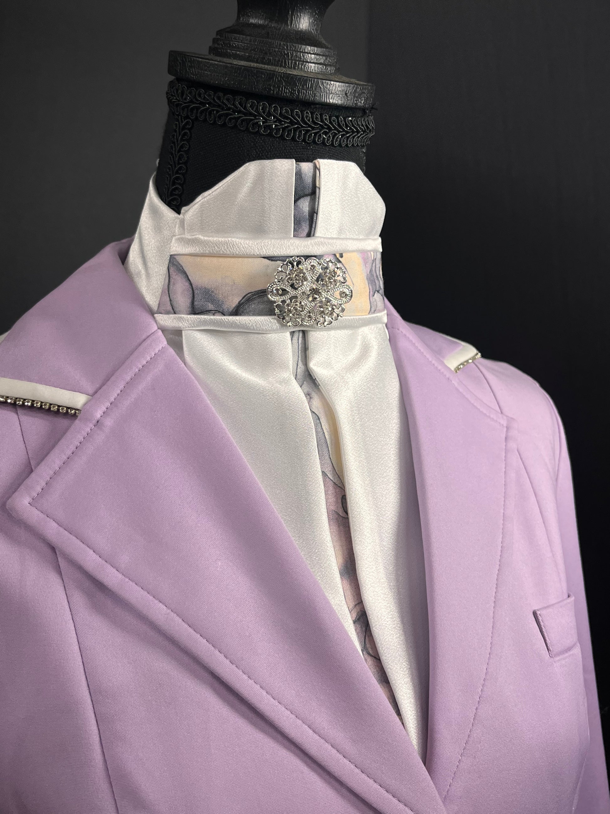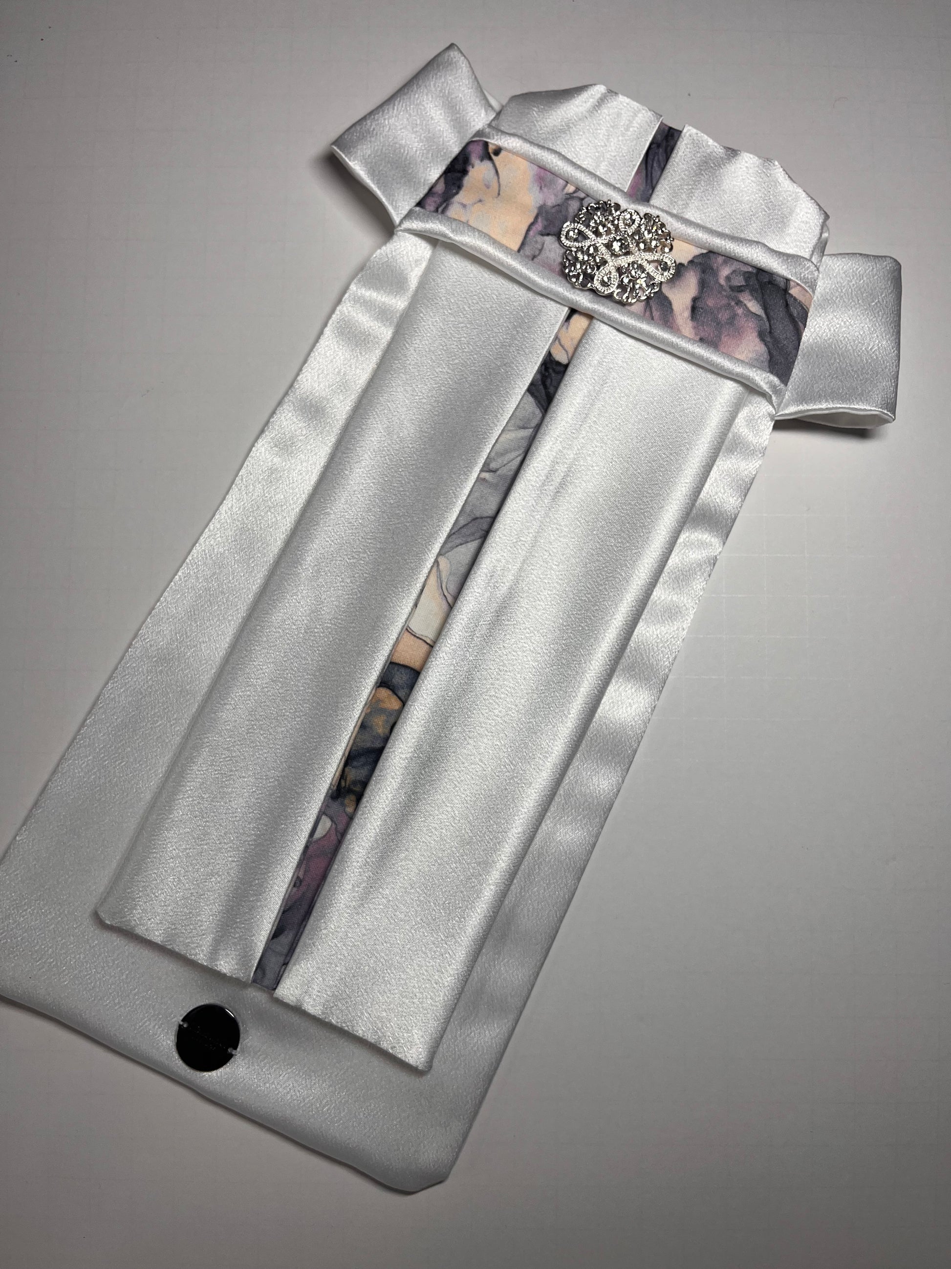 Crisp white satin with marble patterned accent fabric . Finished with a silver brooch