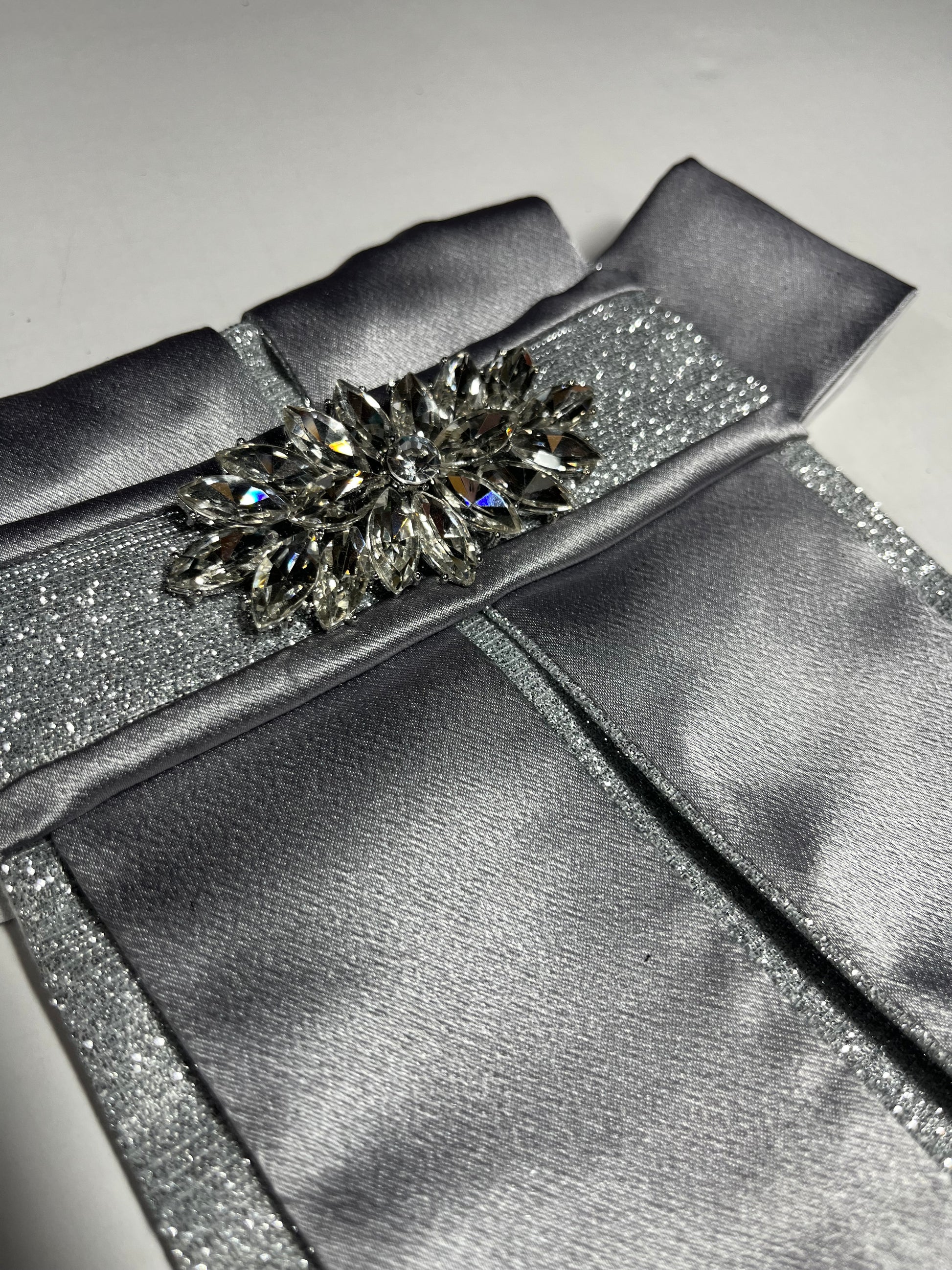 Silver satin fabric with silver shimmer in the peekaboo pleat. Stock ties come with choice of either small rhinestone brooch or large crystal.