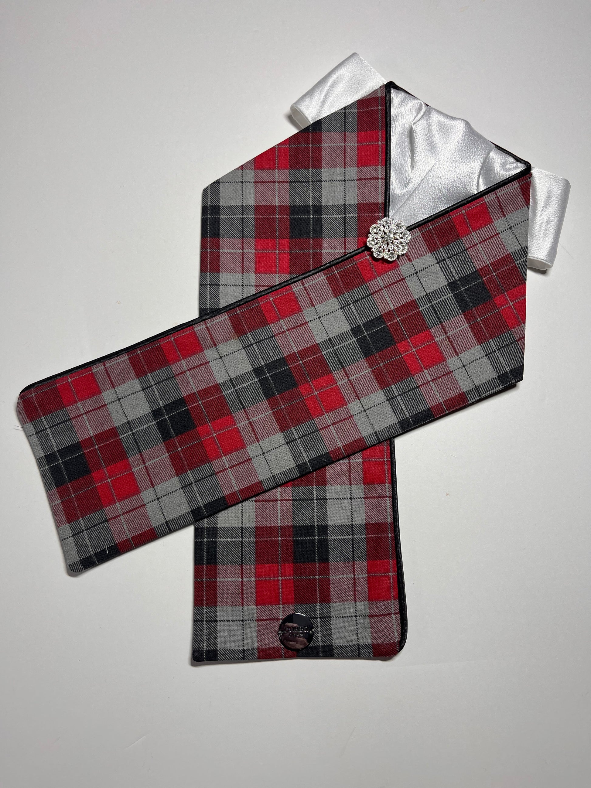 Black, grey , and red plaid fabric with crisp white accents. Adjustable neck. Finished with silver brooch.