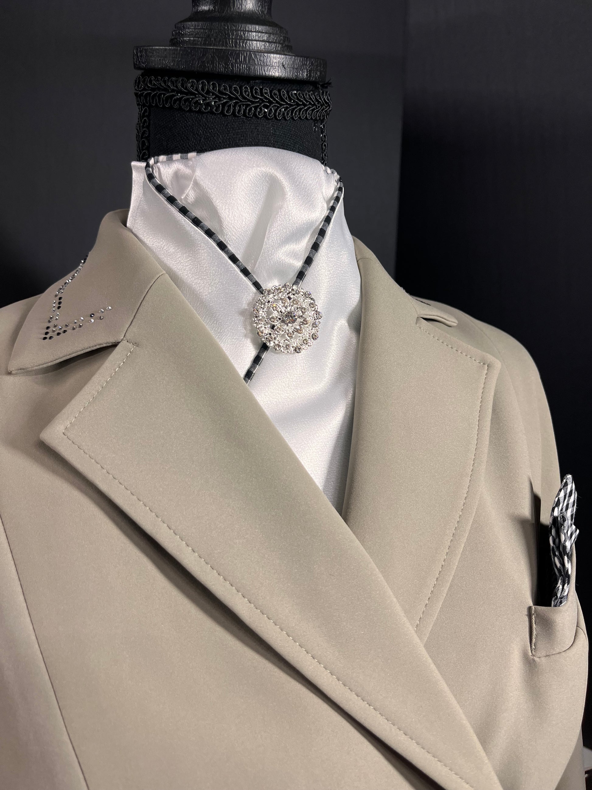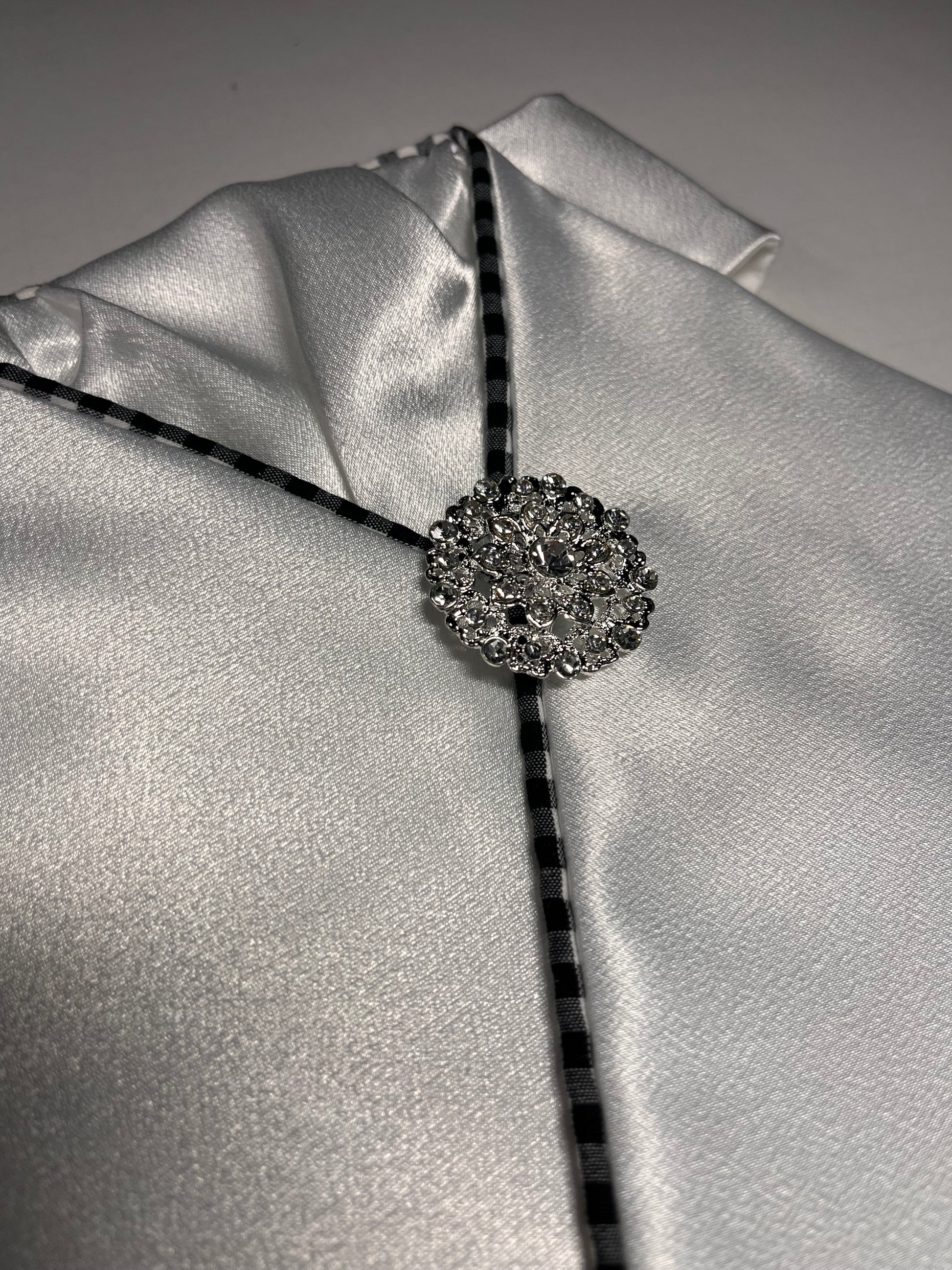 Crisp white with a gingham piping. Simple and straight forward. Finished with a silver brooch.